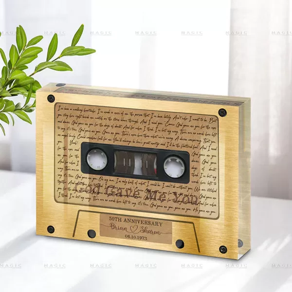 For music-loving couples, a personalized acrylic block featuring a retro radio tape design and lyrics from their favorite love song is a nostalgic and touching gift. This memento will evoke cherished memories every time they see it.