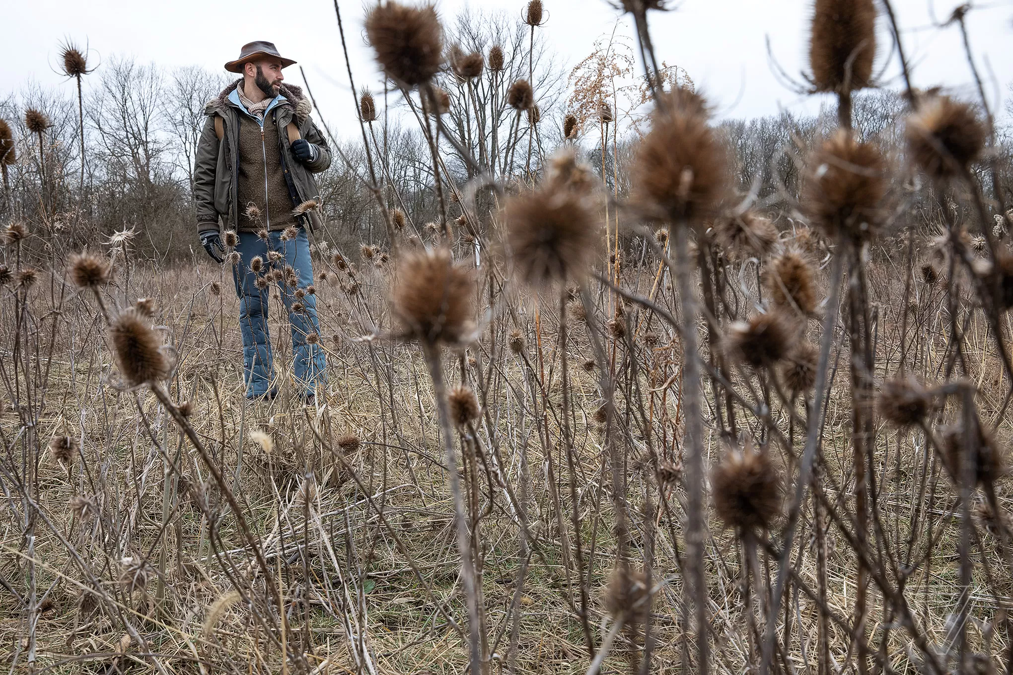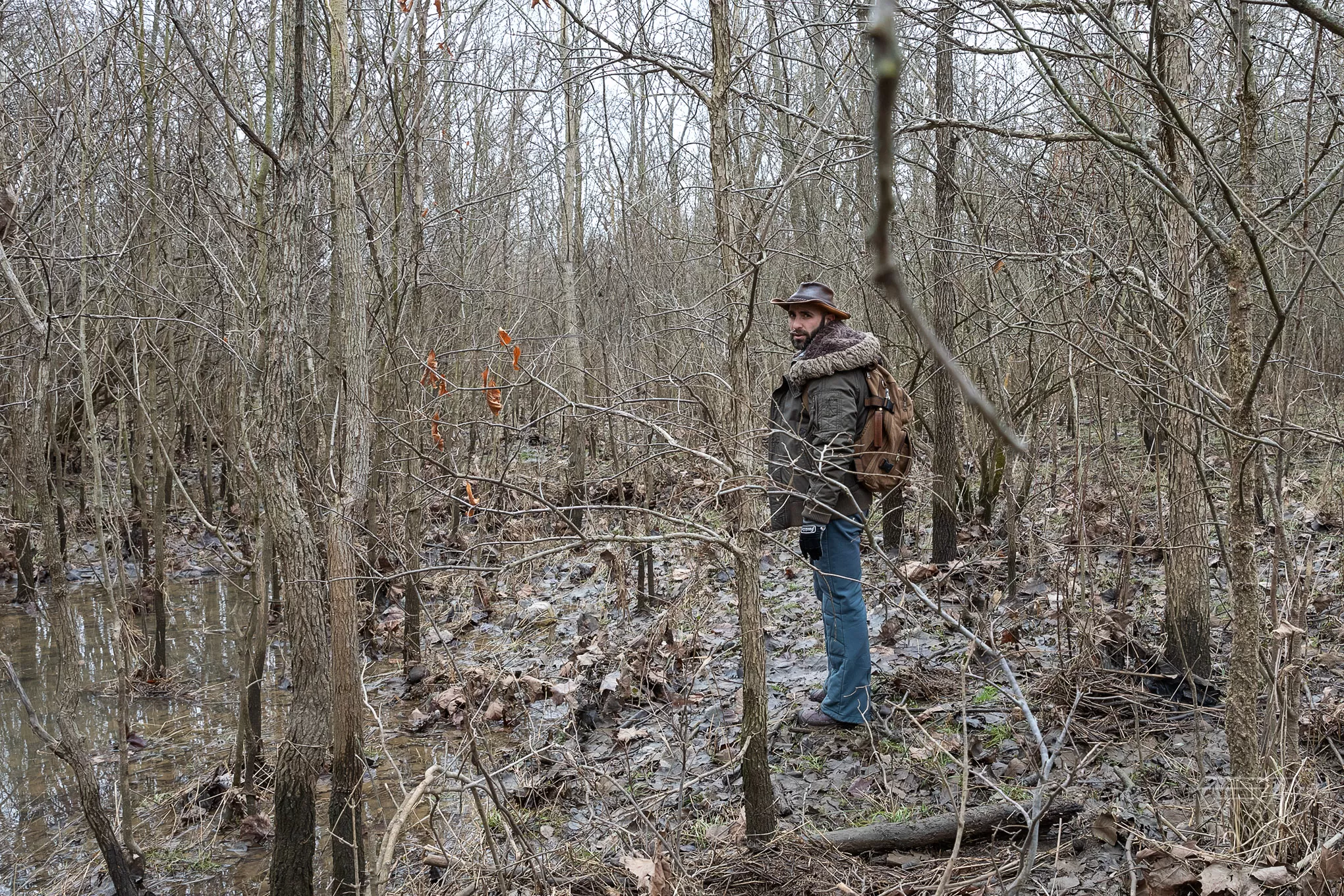 Coyote Peterson walks through a muddy, wooded path in Prairie Oaks Metro Park, showcasing his immersion in the coyote brave wilderness.