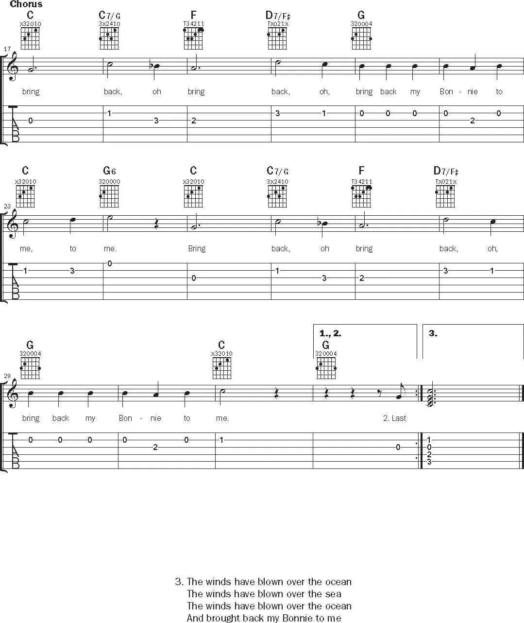 Die anhaltende Popularität von „My Bonnie Lies Over the Ocean“ erstreckt sich auch auf seine Zugänglichkeit für Gitarristen. Ein einfaches Arrangement mit einfachen offenen Akkorden wie C, F, D7, A7 und G fängt die Essenz der Melodie ein. Das Hinzufügen subtiler Variationen, wie z. B. das Spielen des C-Akkords mit einem G im Bass oder die Verwendung eines G6 anstelle eines Standard-G, sorgt für einen Hauch von musikalischer Intrige, ohne die Einfachheit zu beeinträchtigen. Ein klassisches Walzer-Schlagmuster verstärkt den sanften Rhythmus des Liedes und erweckt die Melodie zum Leben.