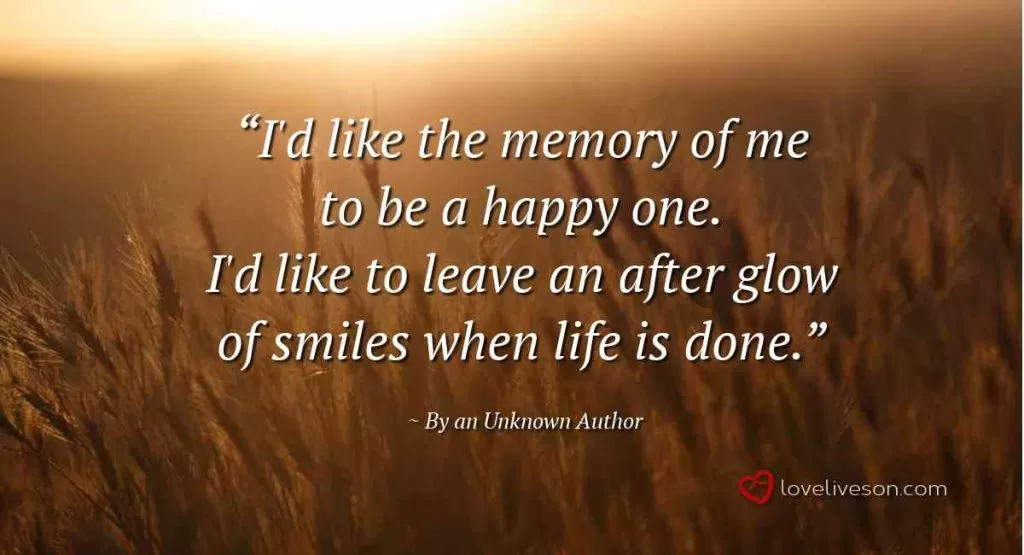 I’d like the memory of me to be a happy one. I’d like to leave an after glow of smiles when life is done. I’d like to leave an echo whispering softly down the ways, Of happy times and laughing times and bright and sunny days. I’d like the tears of those who grieve, to dry before the sun of happy memories that I leave when life is done
