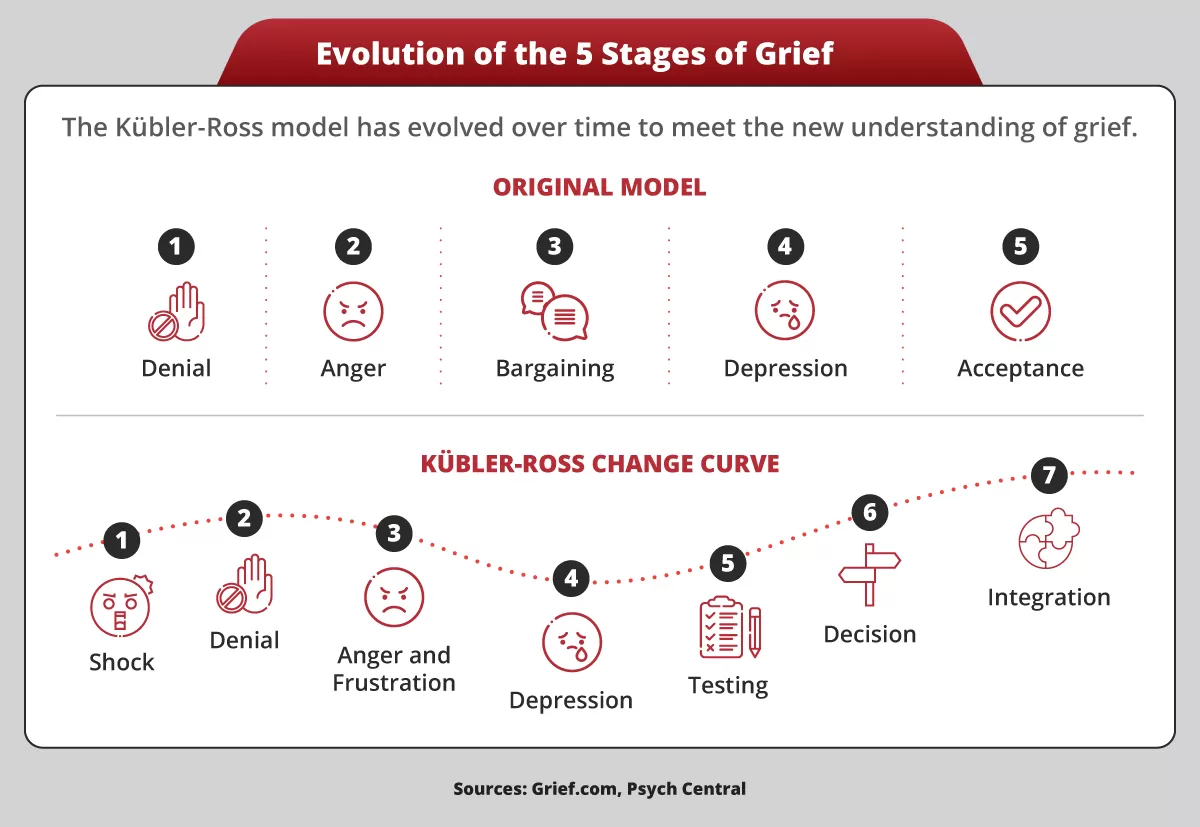 A diagram illustrating the evolution of the stages of grief, from the original five to a seven-stage model, showing denial, anger, depression, and acceptance related to profound loss.