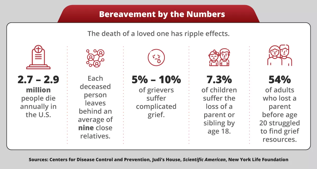 Statistics illustrating the widespread impact of grief and loss in the U.S., including the number of people affected and prevalence of complicated grief.