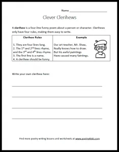 ¡Sumérgete en el encantador y a menudo hilarante mundo de los clerihews! Estos poemas cortos y sencillos son una forma fantástica de explorar el lado más ligero de la poesía y son sorprendentemente fáciles de escribir. Inventado por Edmund Clerihew Bentley cuando apenas era un adolescente, el clerihew es un testimonio de que crear nuevas formas de expresión no está limitado por la edad o la experiencia. Son perfectos para burlarse suavemente de las personas, ya sean figuras famosas, personajes de ficción o incluso tu propia mascota. Si buscas una forma poética que priorice el ingenio y la rima sobre la métrica y la complejidad, explorar ejemplos de clerihew es un excelente punto de partida. ¡Podrías encontrarte rápidamente inspirado para escribir los tuyos!