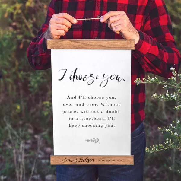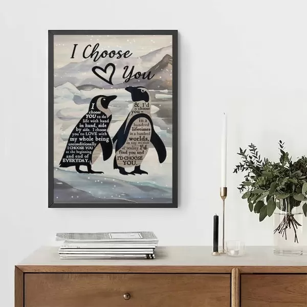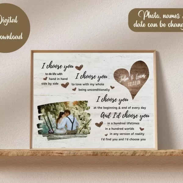Capturez l’essence de votre histoire d’amour avec une toile personnalisée « Je te choisis ». Associez le poème à une photo précieuse, à vos noms et à la date de votre anniversaire pour une pièce d’art vraiment sur mesure. Qu’il s’agisse d’un design d’inspiration vintage, d’une illustration minimaliste en traits de ligne représentant une étreinte amoureuse, ou d’un couple de pingouins espiègles symbolisant un engagement à vie, les options sont infinies.