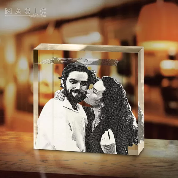 Ce bloc acrylique personnalisé présente votre photo de mariage transformée en un magnifique tableau à l’aquarelle. L’acrylique transparent ajoute une touche moderne, permettant aux couleurs vives de briller.