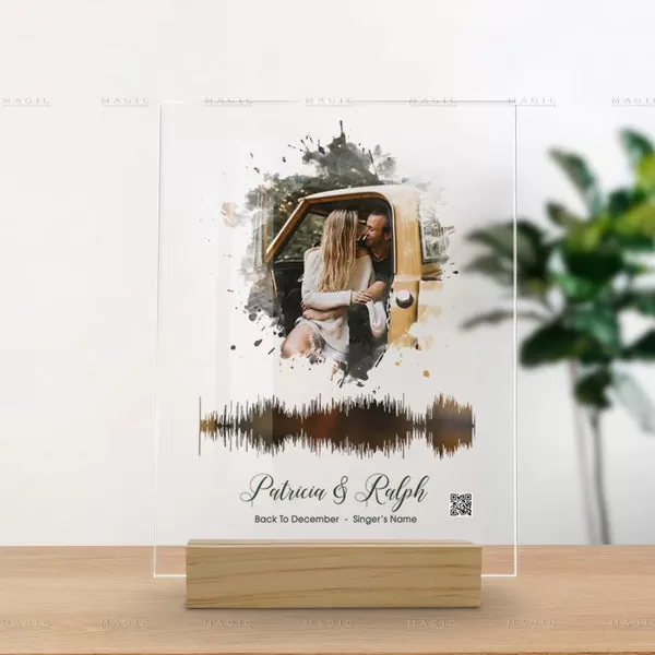 Ce bloc acrylique unique présente un tableau à l’aquarelle de votre photo de mariage ainsi qu’un code QR menant à votre chanson de mariage. Scannez le code pour revivre instantanément les moments spéciaux de votre jour de mariage.