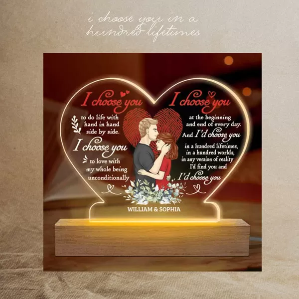 Une veilleuse en forme de cœur gravée de « Je te choisis » offre une présence douce et réconfortante. La douce lueur et le message sincère créent une ambiance chaleureuse, symbolisant la sécurité et l’amour partagés au sein de leur relation.