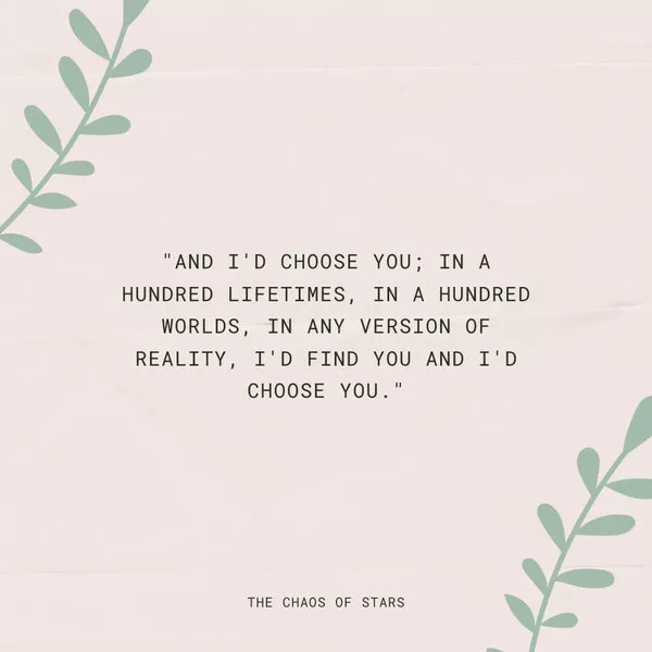 Bien que l’origine exacte de la phrase « Je te choisis, vie après vie » soit incertaine, elle a gagné en popularité en tant que symbole d’amour et d’engagement profonds. Bien que le poème de Kiersten White « And I’d choose you… » tiré de The Chaos of Stars exprime un sentiment similaire, la formulation spécifique « Je te choisis, vie après vie » semble avoir évolué organiquement comme une expression concise et puissante de l’amour éternel.