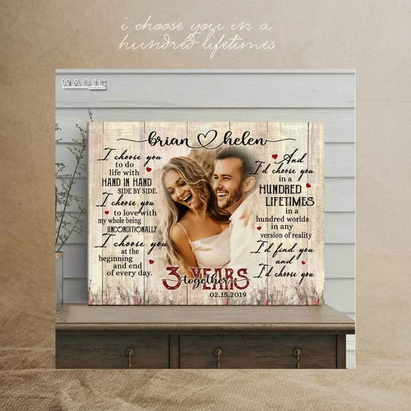 Une toile d’inspiration vintage avec une photo en noir et blanc et le poème « Je te choisis pour vivre ma vie avec toi » évoque un romantisme intemporel. Ce cadeau personnalisé capture la nature durable de leur amour, célébrant le chemin parcouru ensemble.