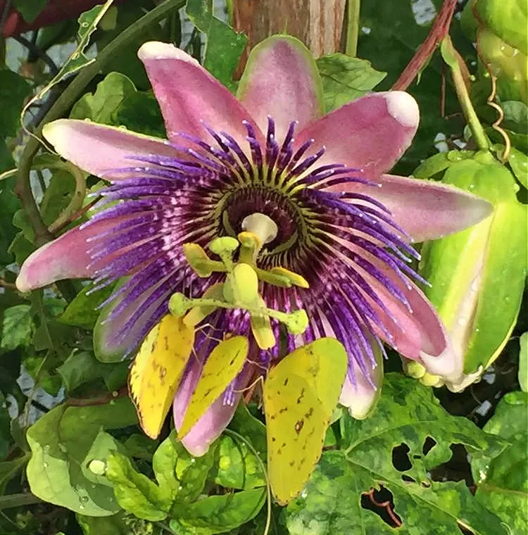 Gros plan d'une fleur de la passion rose avec un papillon jaune se nourrissant de son nectar.