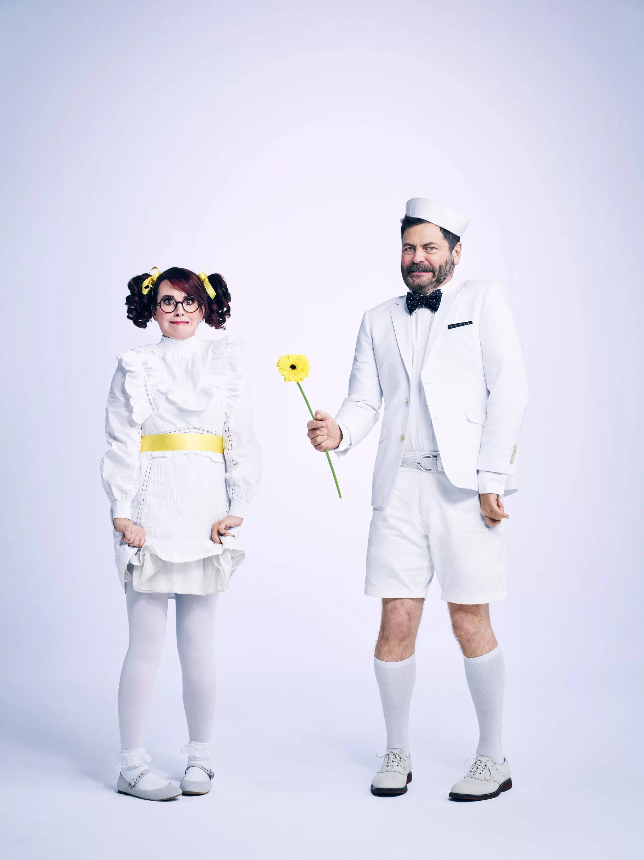 Une image inhabituelle présente Megan Mullally et Nick Offerman vêtus de simples vêtements blancs, adoptant des poses maladroites, illustrant le style photographique unique et franc qui accompagne leurs mémoires conversationnelles.