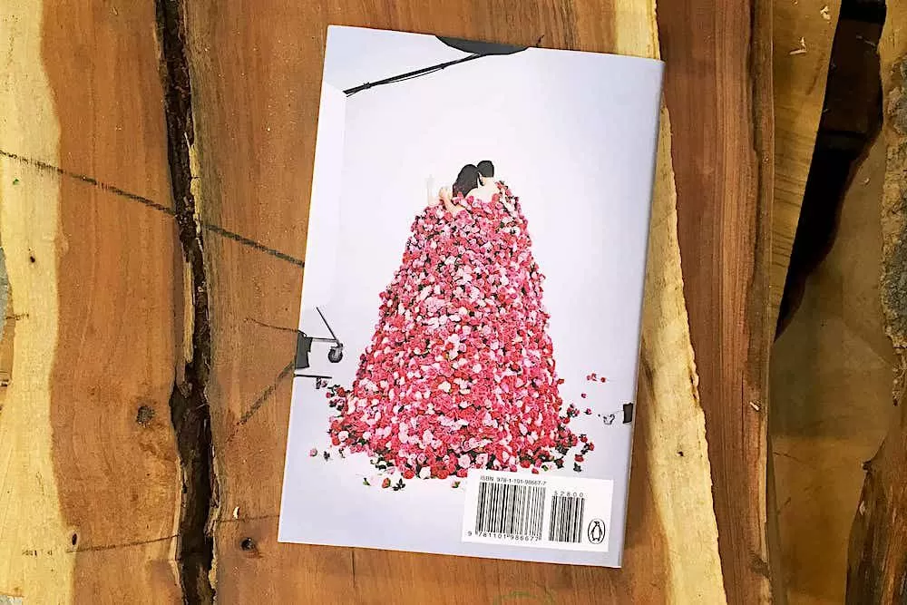 La couverture arrière du livre posée sur une planche en bois, montrant une image tendre de Nick Offerman et Megan Mullally sous une cascade de roses, symbolisant la profondeur romantique derrière l'extérieur humoristique du livre.
