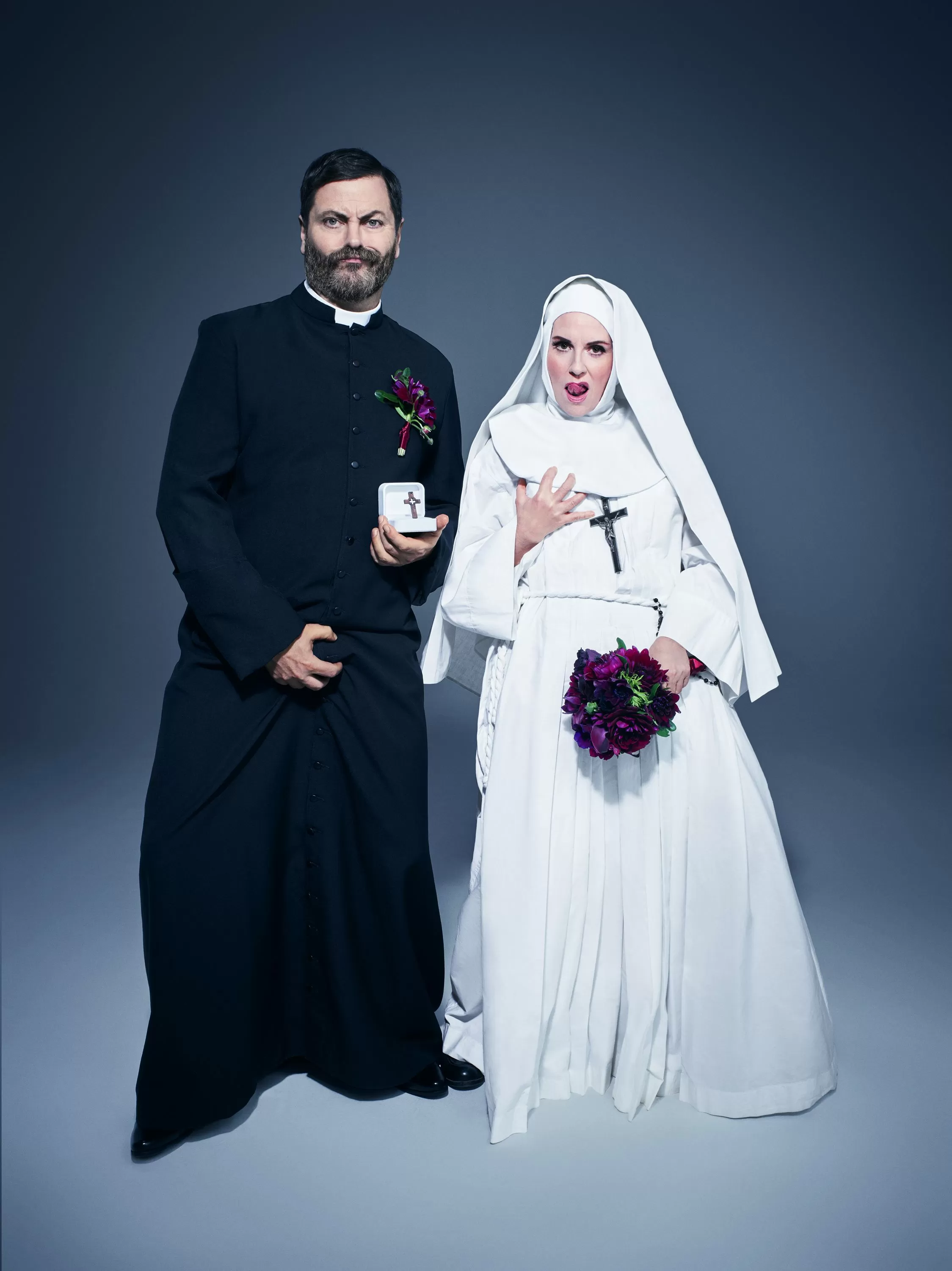 Une photo humoristique montre Nick Offerman et Megan Mullally déguisés en prêtre et nonne, reflétant la promesse du livre d'aperçus hilarants, honnêtes et non conventionnels de leurs vies et de leur relation.