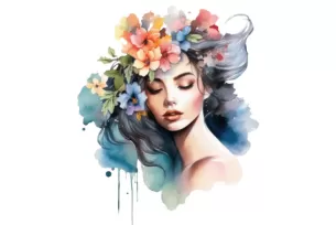 A dreamy watercolor portrait of a woman with flowers in her hair, symbolizing love at first sight.