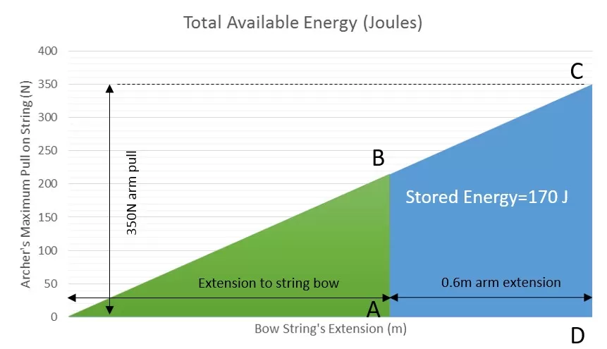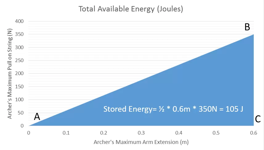 Let’s delve into the physics. A strong man can draw a bowstring back about 60 cm with a maximum force of approximately 350 N. This translates to 210 Joules of potential energy. In a standard bow, the stored energy is equal to the area under the force-displacement curve.