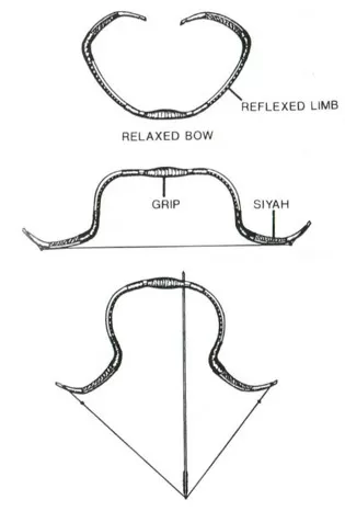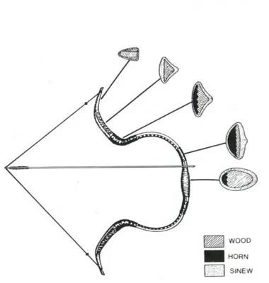 Sketch of composite bow with cross sectional views of materials. The sinew is in tension and horn in compression