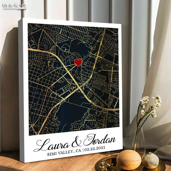 A custom canvas map zoomed in on the location of your first kiss is a modern and artistic way to commemorate the occasion. This unique piece allows you to relive the memory every time you look at it.