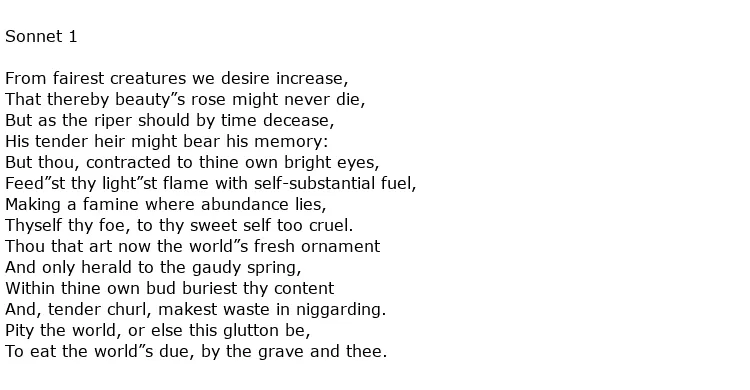 A close-up image displaying the text of William Shakespeare's Sonnet 1, lines 1-14, demonstrating the structure of a Shakespearean sonnet with visible text characters.